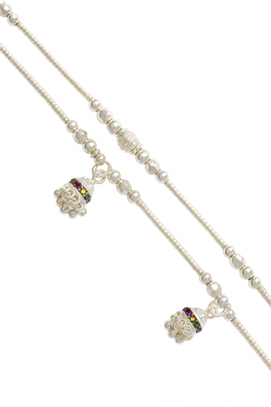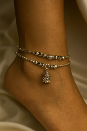 Radiate grace and joy with Miora’s Beaded Silver Anklet, an exquisite blend of tradition and vibrant charm. Designed with sleek silver beads and adorned with multicoloured stone-studded ghungroo danglers, this anklet beautifully captures the rhythm of festivity and style.