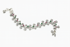 Embrace timeless heritage with Miora’s Antique Floral Anklet — a stunning piece inspired by traditional Indian artistry. Crafted in fine oxidized silver, this anklet features intricate floral motifs adorned with alternating green and maroon stones, adding a royal charm to every step. The beautifully detailed leaf-shaped danglers lend it a rhythmic grace that enhances its ethnic appeal.
