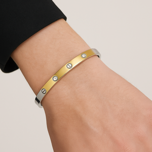 A timeless expression of modern sophistication, this Sterling Silver Gold-Tone Bangle embodies strength and elegance in every curve. The sleek dual-tone finish — radiant gold on the outside and cool silver within — creates a perfect balance of luxury and minimalism. Embellished with screw motifs and shimmering zirconia accents, it’s a subtle statement piece that complements both contemporary and classic looks effortlessly.