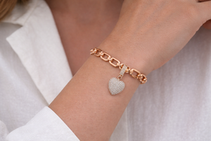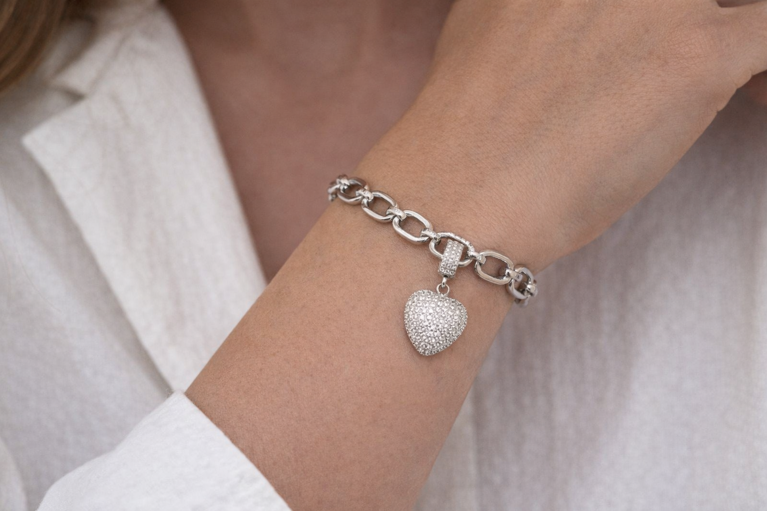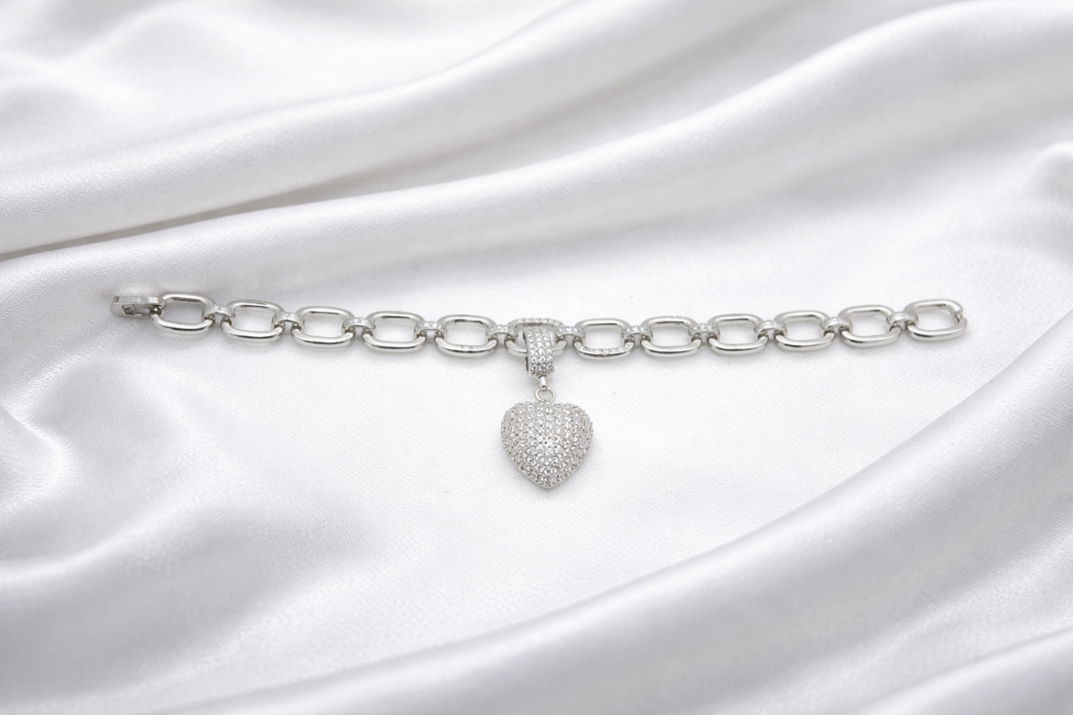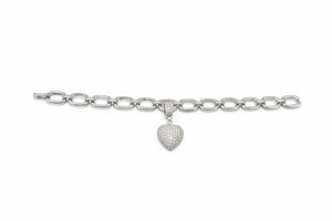 Elegant and timeless, this silver link bracelet is accented with a dazzling pavé heart charm that catches the light from every angle. The polished oval links create a modern yet classic silhouette, while the fully encrusted heart adds a romantic touch of sparkle. Finished with a secure clasp, this bracelet is perfect for everyday elegance or special occasions. A beautiful symbol of love and sophistication, it makes a thoughtful gift or a standout addition to any jewelry collection.