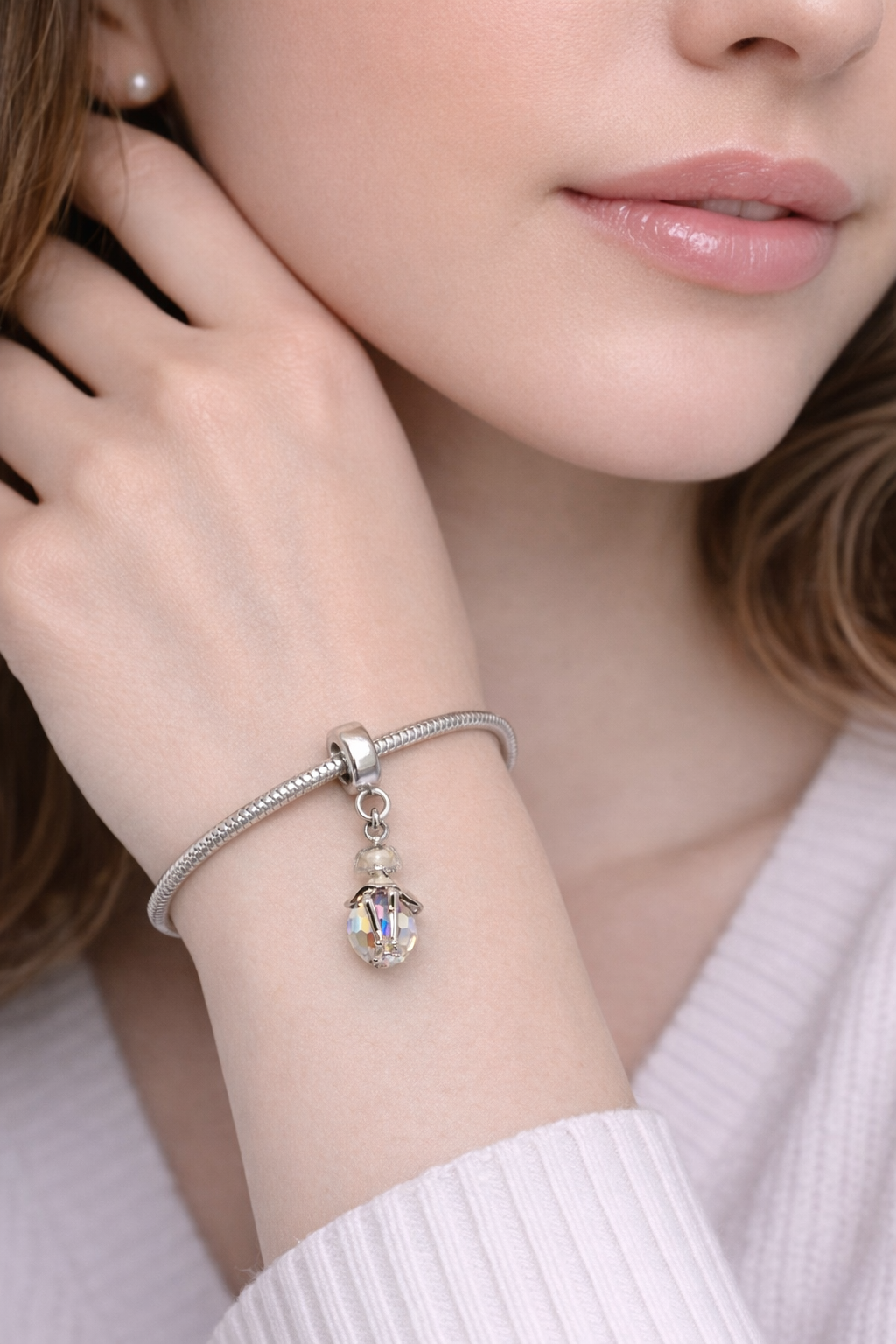 A delicate doll charm accented with crystal detailing, adding sparkle and graceful charm to jewellery. Approx dimensions: 14mm x 10mm.