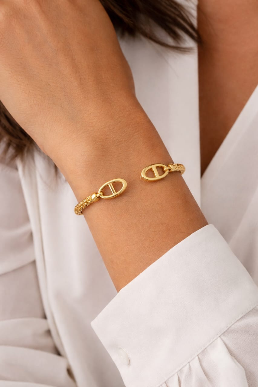 Gracefully crafted with a refined braided design, this Miora open cuff bracelet is a timeless expression of elegance. Made in sterling silver and finished with a radiant gold plating, the intricate weave adds texture while maintaining a clean, sophisticated look.