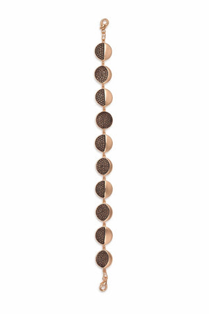 A striking blend of modern design and refined elegance, this rose gold–toned sterling silver bracelet features a series of circular disc links accented with shimmering black stones. The alternating polished and textured surfaces create a bold yet balanced look, making it perfect for both everyday wear and evening styling. Designed to stand out while remaining effortlessly graceful, this bracelet adds a touch of contemporary luxury to any jewellery collection.