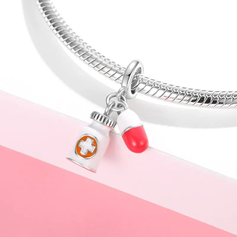 A thoughtful charm featuring a red capsule and a mini medicine bottleâperfect for medical professionals, nurses, doctors, or anyone who values health and healing. A meaningful piece symbolizing care, strength, and compassion.