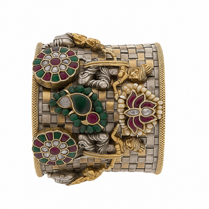 This majestic handcrafted kada celebrates the grandeur of Indian temple artistry. Designed in an antique sterling silver finish, it features intricate depictions of divine figures and traditional motifs, symbolizing strength, devotion, and timeless beauty. The woven metal band creates a striking foundation, while the detailed embellishments of ruby, emerald, and pearl accents add royal elegance. Perfect for collectors and connoisseurs of fine heritage jewellery, this piece effortlessly bridges tradition and opulence, making it a statement of culture and craftsmanship.