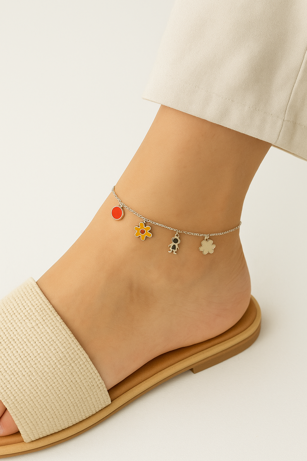 Add a burst of joy to your style with this vibrant Miora Multi-Charm Silver Anklet. Designed with a collection of adorable enamel charms — including a red apple, orange flower, green lime slice, and cute boy-girl silhouettes — this piece captures the essence of fun and freedom. Crafted in pure 925 sterling silver, it’s light, playful, and perfect for women and girls who love adding personality to their look. Each charm swings gracefully, bringing color and cheer to every step you take.